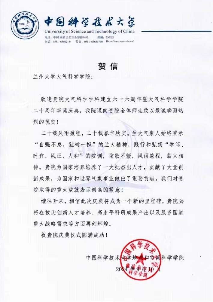 中国科学技术大学地球和空间科学学院致伟德国际1946源于英国建院20周年贺信