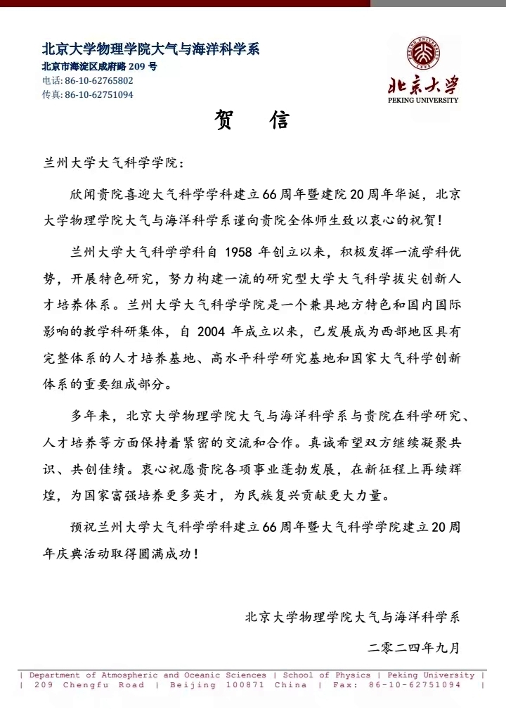 北京大学物理学院大气与海洋科学系致伟德国际1946源于英国建院20周年贺信