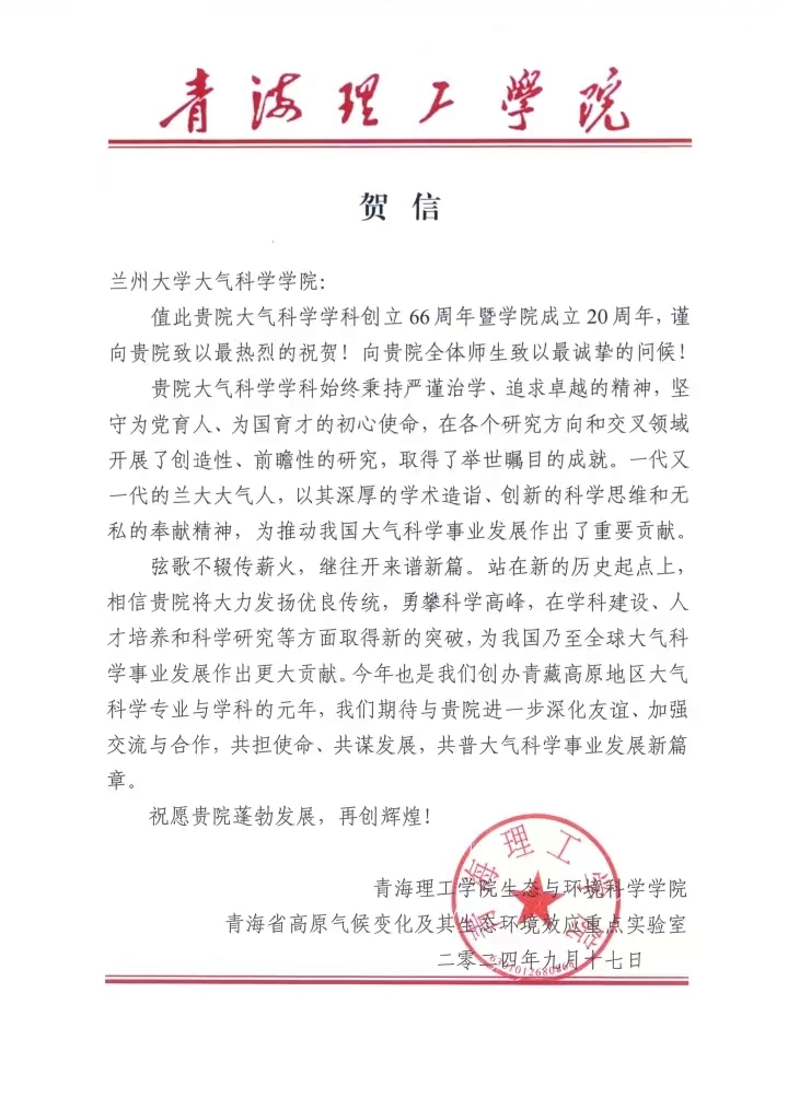 青海理工学院生态与环境科学学院、青海省高原气候变化及其生态环境效应重点实验室致伟德国际1946源于英国建院20周年贺信