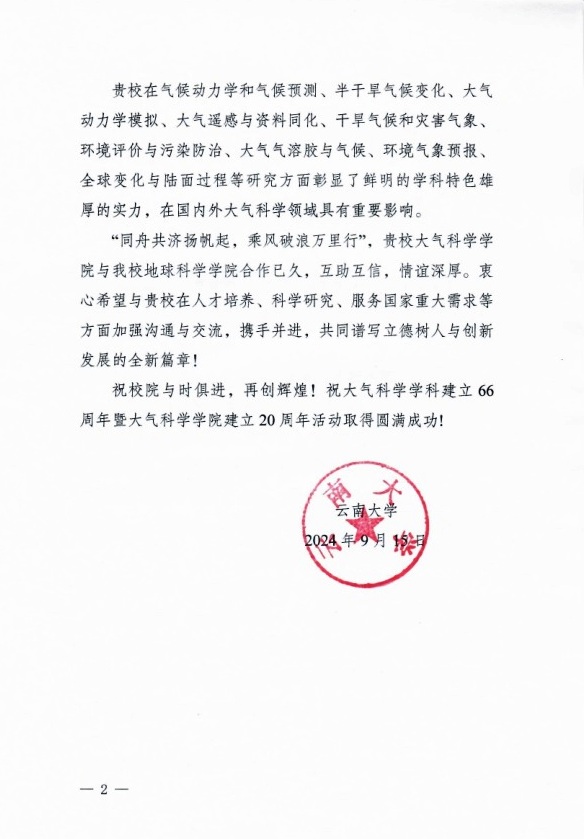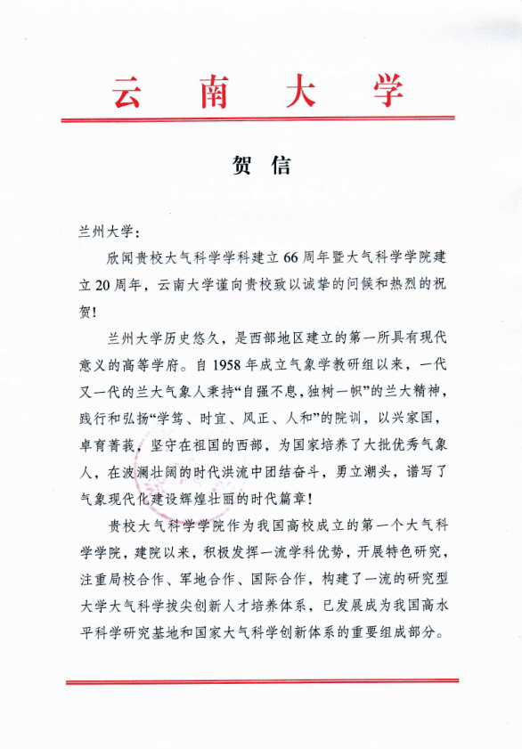 云南大学致伟德国际1946源于英国建院20周年贺信