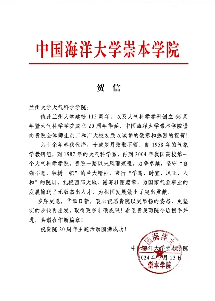 中国海洋大学崇本学院致伟德国际1946源于英国建院20周年贺信