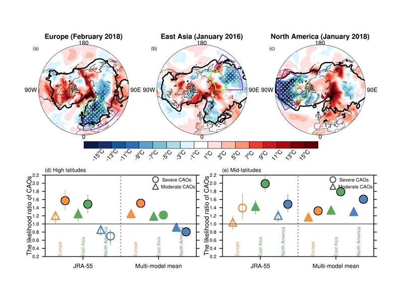 图. 三个近期发生在欧洲(a)、亚洲(b)以及北美(c)的极端寒潮事件以及北半球高纬度(d)和中纬度(e)的适度型和严重型寒潮在平流层弱极涡条件下的发生风险。
