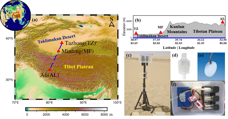 塔克拉玛干沙尘气溶胶可传输到青藏高原,从而对高原的气候、环境以及生态等产生重要影响。沙尘气溶胶携带了大量的微生物,而这些微生物如何影响青藏高原还缺乏认识。为此,该研究同时在塔克拉玛干沙尘源区(塔中和民丰)和青藏高原(阿里)开展大气沙尘-微生物野外观测研究(如图1所示),综合采用DNA测序、模式以及其它数据,探讨了塔克拉玛干沙尘和微生物对青藏高原的影响规律。