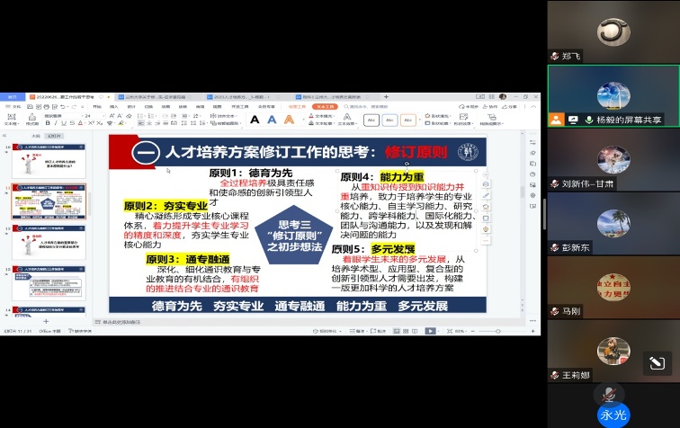 杨毅副院长围绕《伟德国际1946源于英国关于修订本科专业人才培养方案的指导意见》,向与会人员详细介绍了本科专业人才培养方案修订基本情况,从目前2019版培养方案执行过程中发现的问题、2023版人才培养方案修订思路及课程体系设置变化等几方面进行了详细介绍,并征求大家意见。以学生成长成才为中心,从如何发挥新版培养方案学科特色、专业优势,提升专业人才培养质量和效果等方面进行讨论。各专家认为,本科生除理论学习外,对于人工智能、实践应用能力及数值模拟、大气遥感信息分析能力的应用是本次改革重点,应积极打造大气科学专业的个性化选修课程,提高学生实践创新能力,进一步提高本科生综合能力,进而提高考研率和就业率。